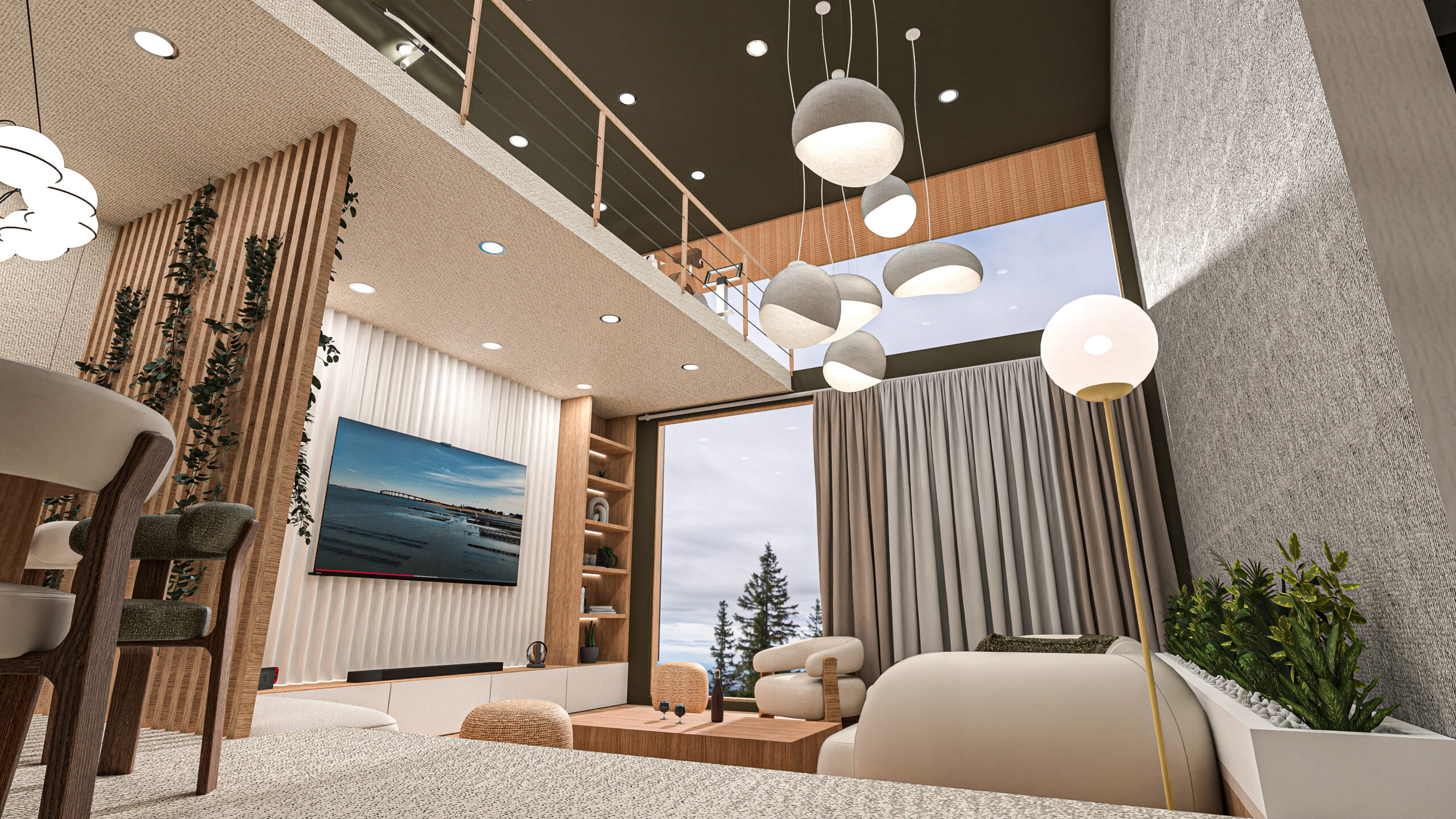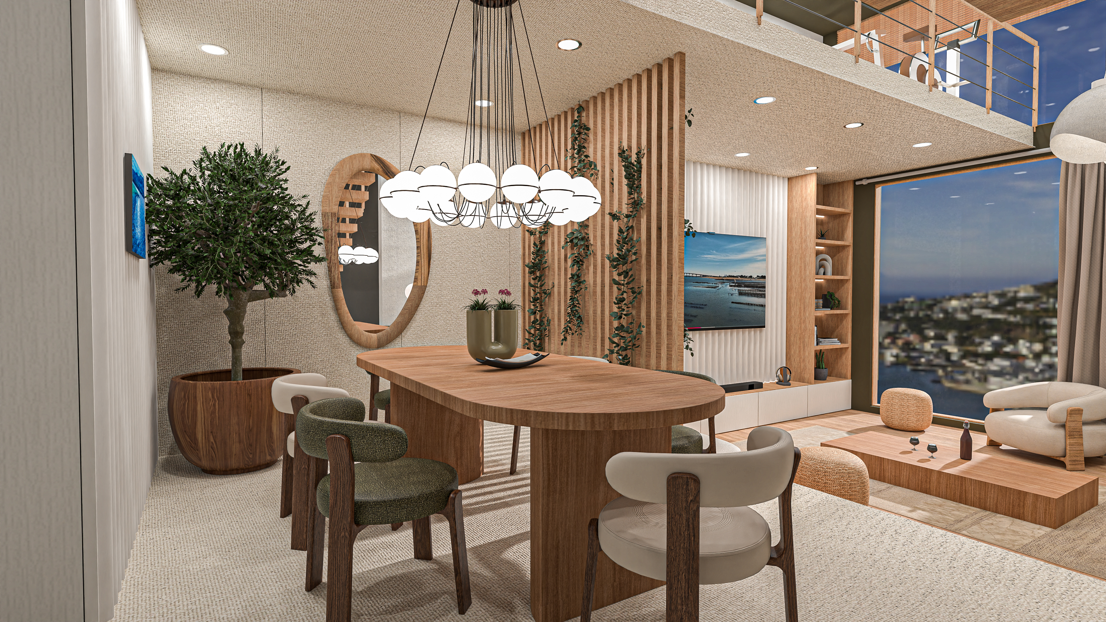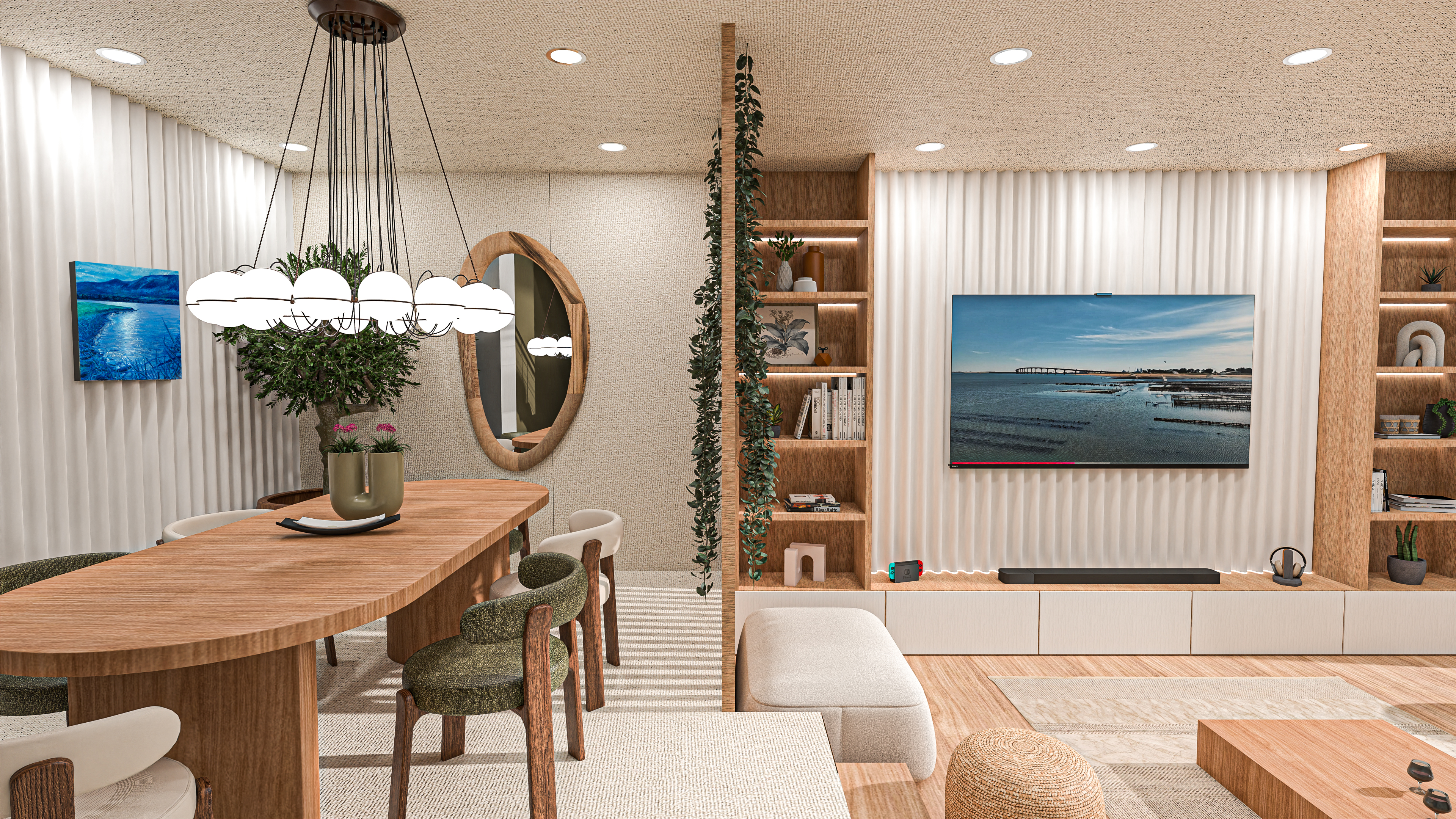 Le mobilier, sélectionné majoritairement chez Kave Home, met en avant des formes douces et arrondies qui rappellent le mouvement des vagues, invitant à la détente. La palette de couleurs neutres, ponctuée de touches végétales, crée une ambiance sereine et accueillante, renforcée par un éclairage subtil intégré dans les étagères et les éléments de séparation.