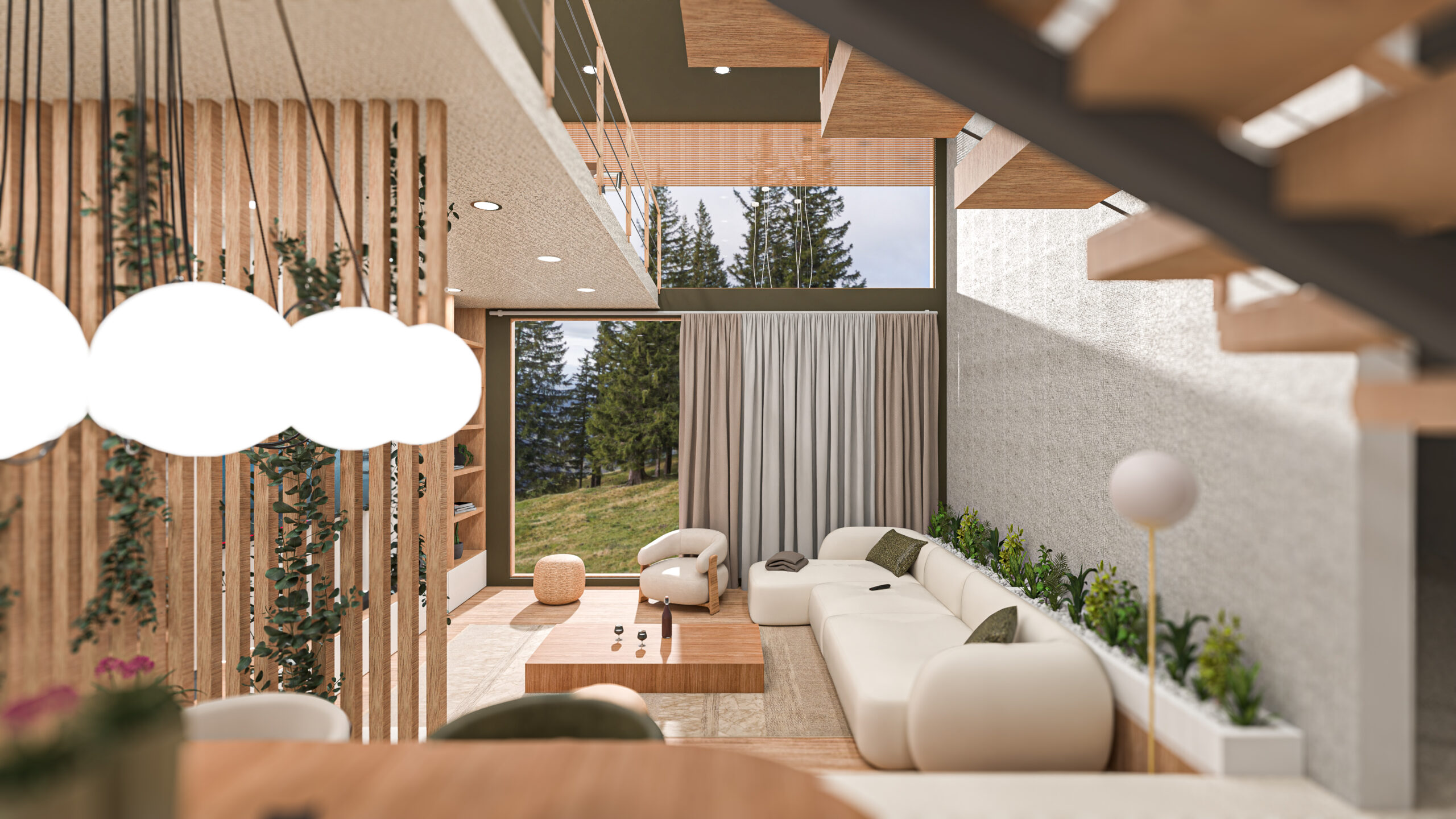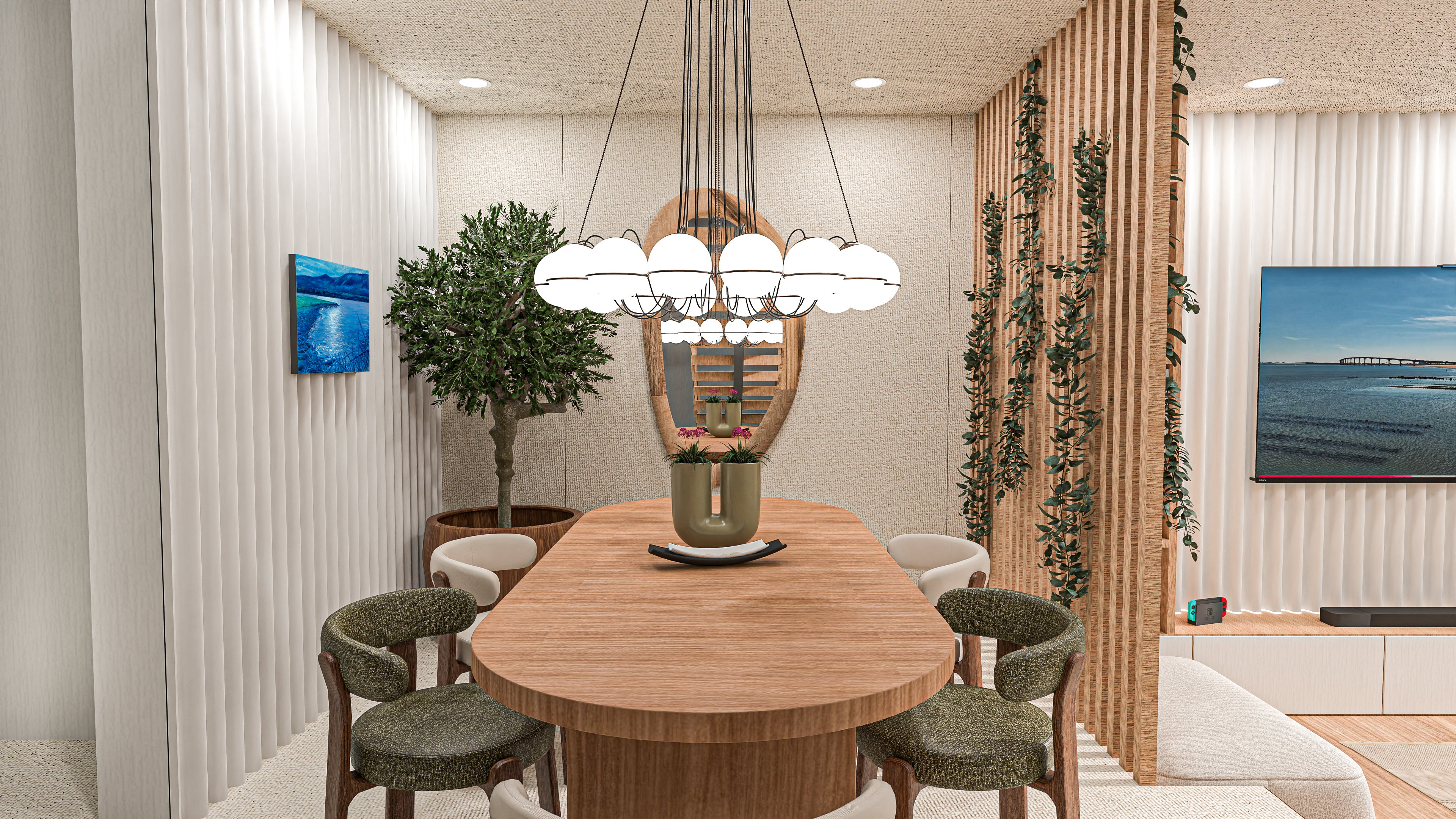 Les matériaux et les formes organiques se mêlent pour offrir un espace où l’élégance se fond harmonieusement avec le naturel. Le bois joue un rôle central dans la composition de cet intérieur, apportant chaleur et authenticité à travers des claustras verticaux et des éléments d’ameublement à la fois simples et épurés.